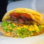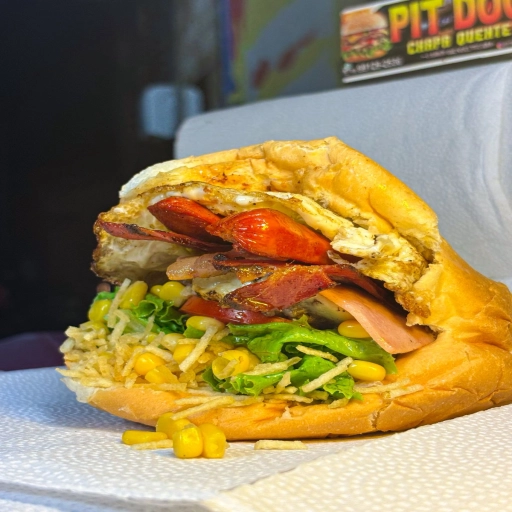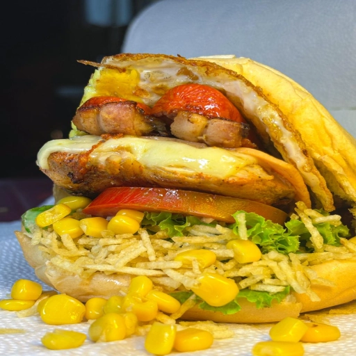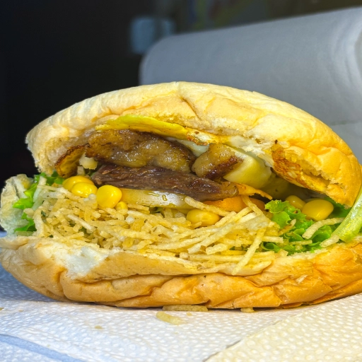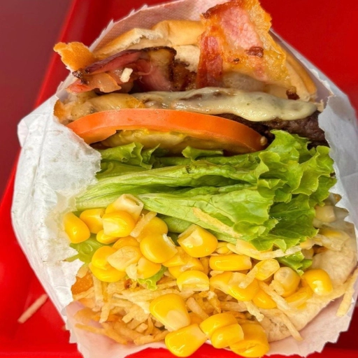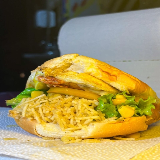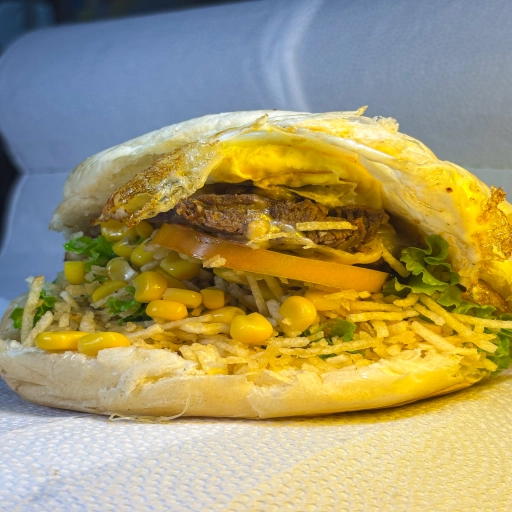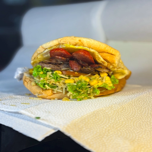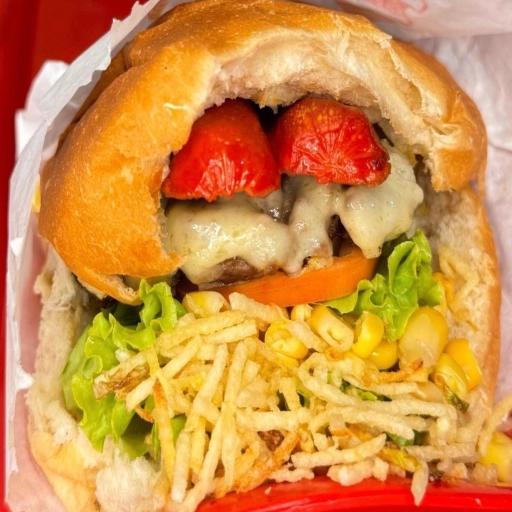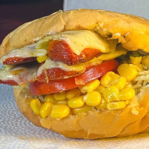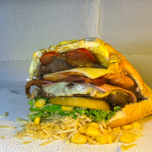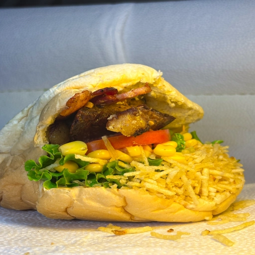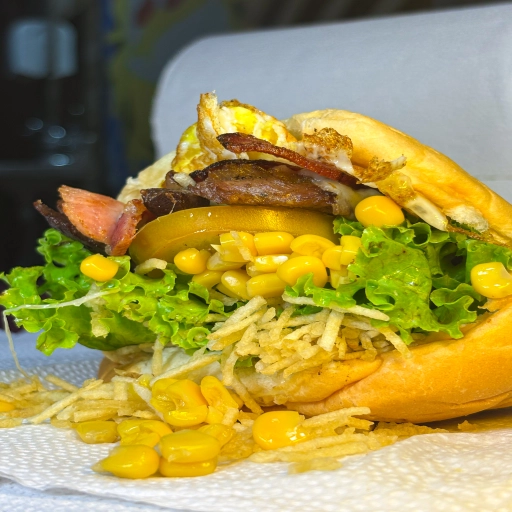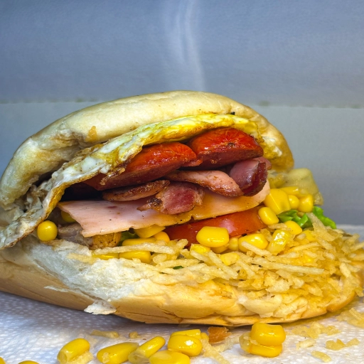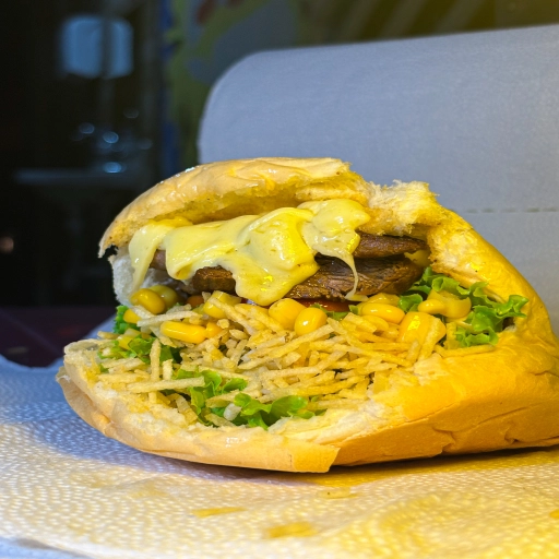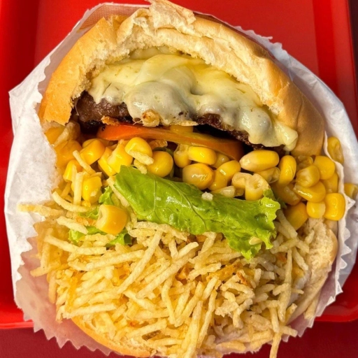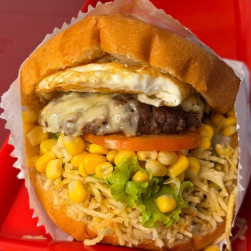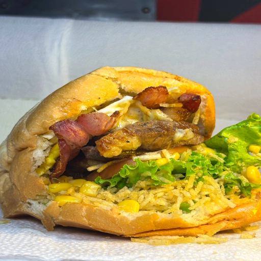 Para quem gosta de misturar o sabor. Pão, Hambúrguer, Queijo, Salsicha, Alface, Tomate, Milho e Batata Palha.
