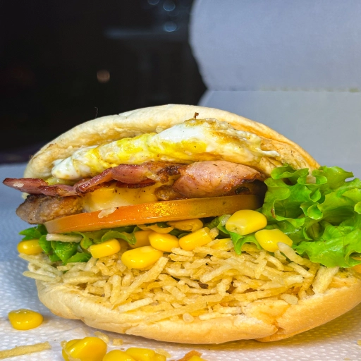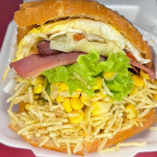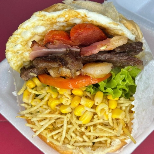 Pão, Hambúrguer, Queijo, Ovo, Alface, Tomate, Milho e Batata Palha.