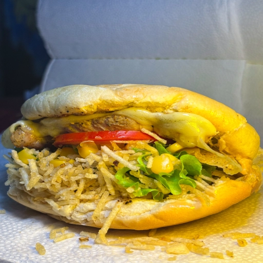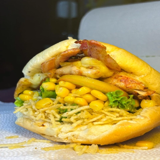 Pão, Frango, Bacon, Queijo, Alface, Tomate e Milho.