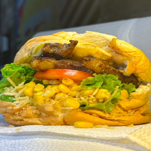 Pão, Lombo, Ovo, Queijo, Alface, Tomate e Milho.