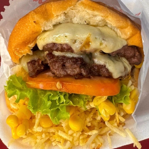 Dois hambúrgueres num só! Dobrando o sabor e a felicidade. Pão, 2 Hambúrgueres, Queijo, Alface, Tomate, Milho e Bata... Ver completo