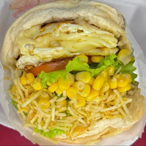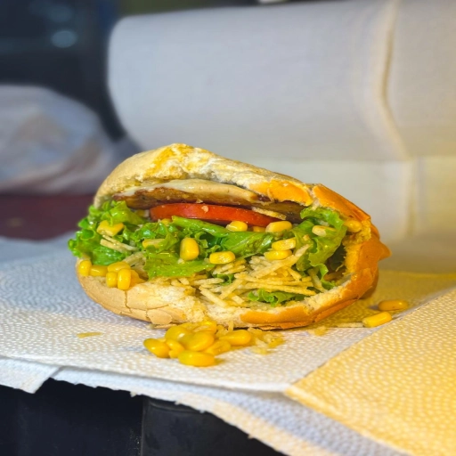 Sem carne, mas com sabor de sobra! Pão, 2 Ovos, 4 Queijos, Alface, Tomate e Milho.