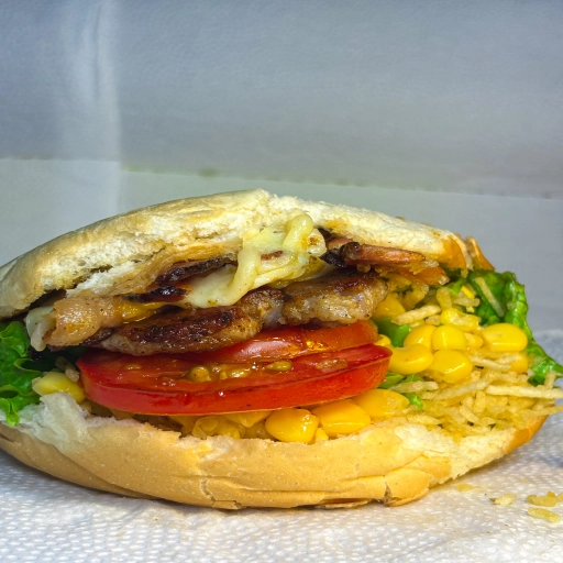 Pão, Lombo, Bacon crocante, Queijo, Alface, Tomate e Milho.