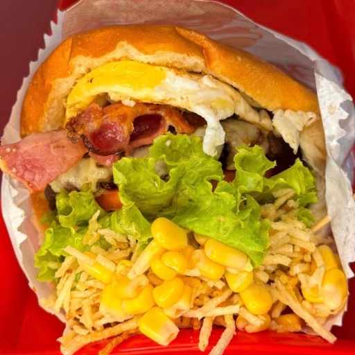Sabor em dose dupla! Bacon e Ovo juntos. Pão, Hambúrguer, Queijo, Ovo, Bacon, Alface, Tomate, Milho e Batata Palha.