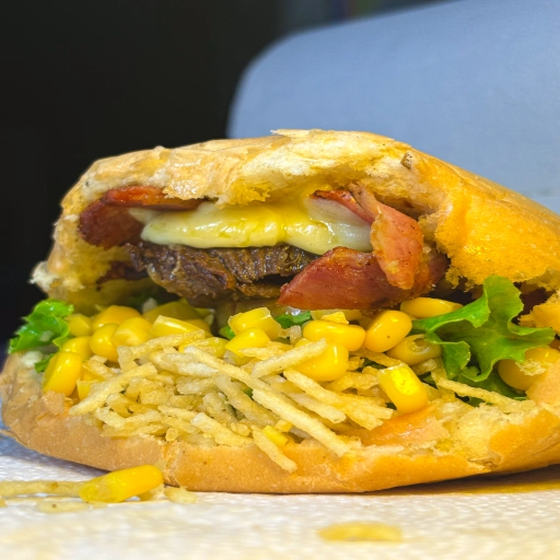 Pão, Filé, Bacon crocante, Queijo, Alface, Tomate e Milho.