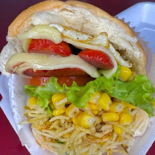 Pão, 2 Salsichas, Ovo, Queijo, Alface, Tomate e Milho.