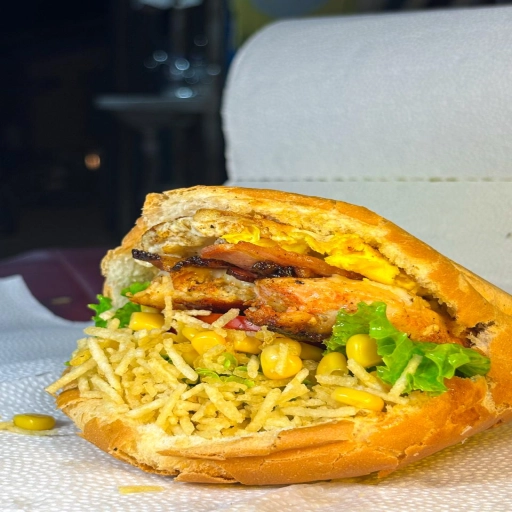 Pão, Frango, Bacon, Ovo, Queijo, Alface, Tomate e Milho.